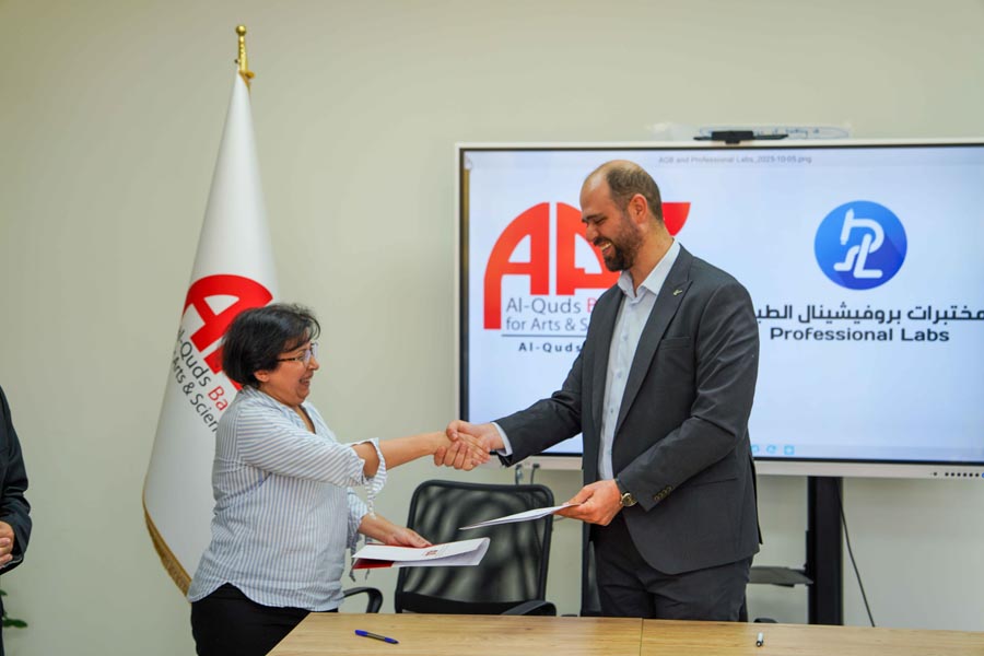 The agreement was signed by Dr. Amneh Badran, Acting Dean of Al-Quds Bard College, and Mr. Ayoub Assi, General Director of Professional Laboratories. This partnership reflects the two institutions’ commitment to strengthening ties between the academic and medical sectors and highlights their shared vision to integrate academic knowledge with practical applications.